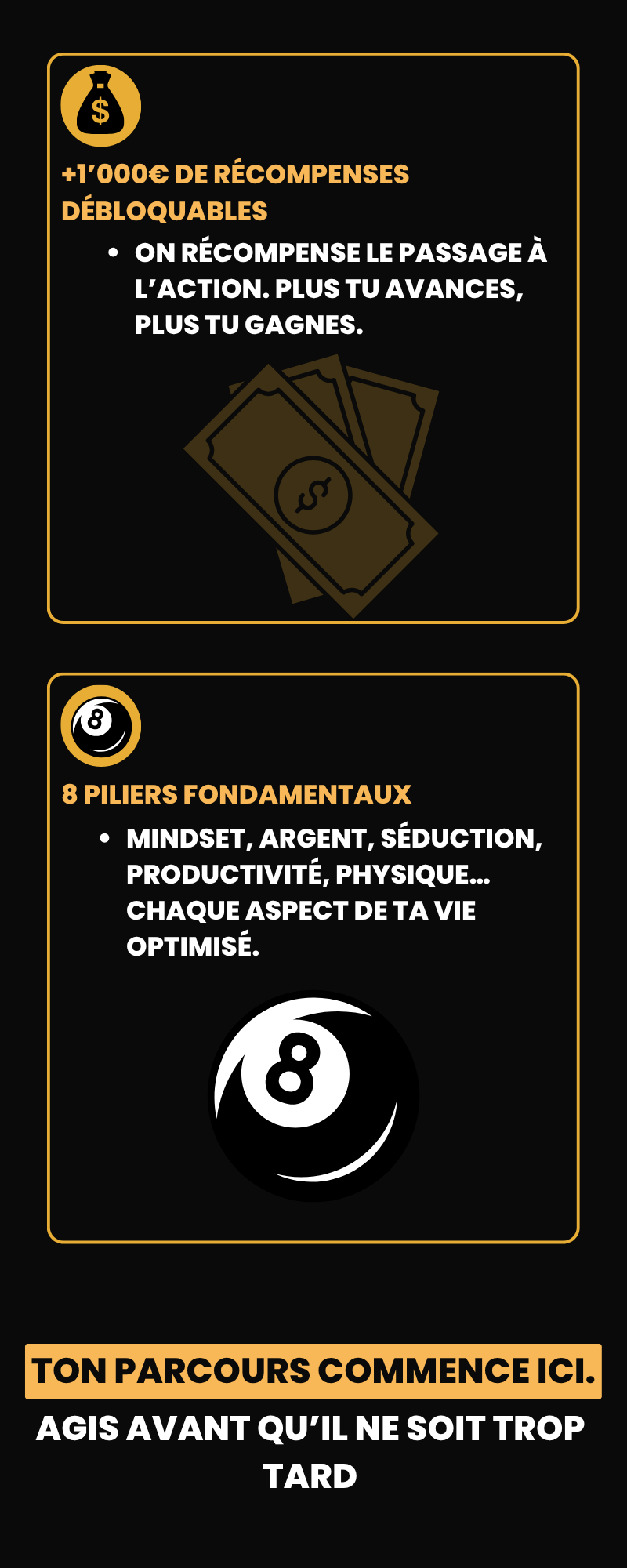 Le programme couvre divers domaines tels que l'évolution du mindset, l'aspect financier, la masculinité, la séduction, la sexualité et la productivité. Il est conçu pour vous rendre 10 fois plus compétent dans tous les domaines de votre vie et transformer chaque défi en victoire.