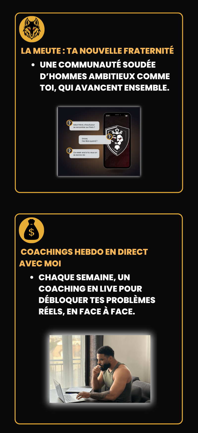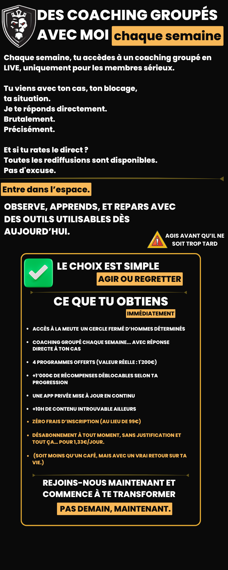L'adhésion vous donne accès à plus de 10 heures de contenu exclusif, couvrant huit domaines majeurs pour assurer une transformation optimale de BETA en ALPHA. Vous débloquerez instantanément mes 4 programmes (1200€ de valeur offerte) ainsi que l'accès aux coachings groupés, l'accès à l'application dédiée, l'accès à la communauté LA MEUTE