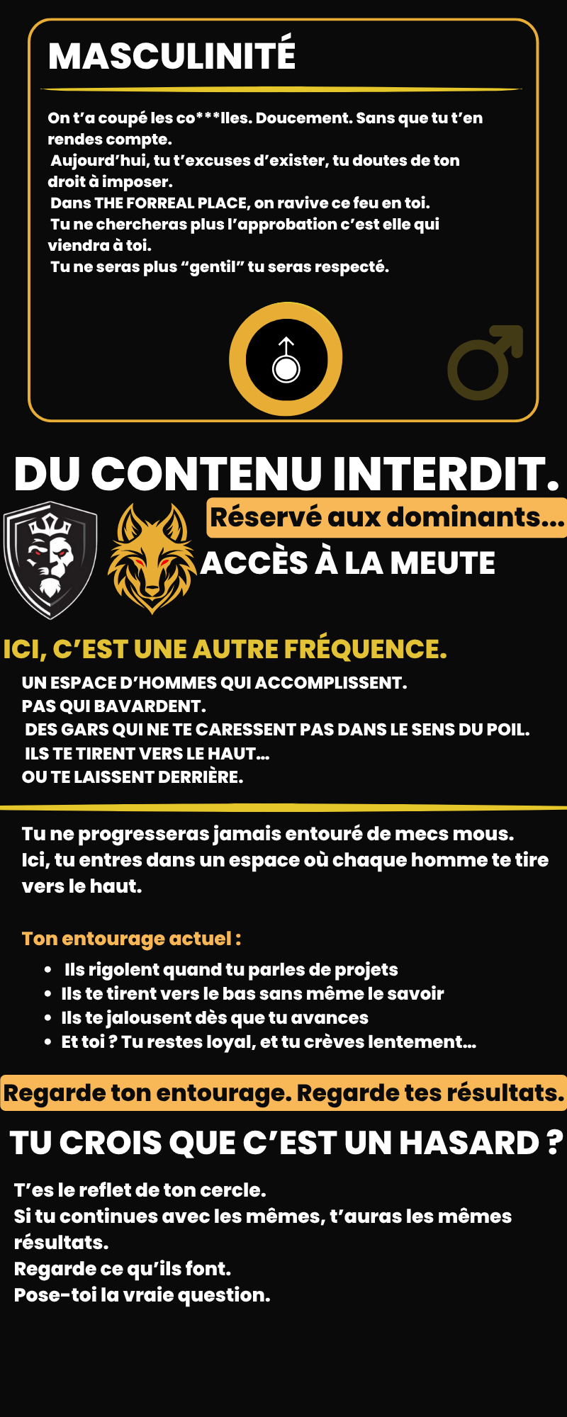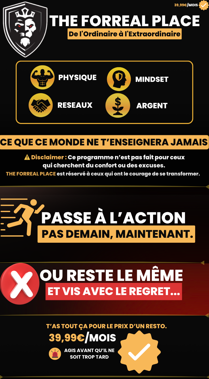 THE FORREAL PLACE est conçue pour les hommes qui cherchent à élever leur vie au niveau ALPHA dans tous les aspects, de la forme physique et du succès financier, en passant par le succès avec les femmes et l'amélioration de votre mindset